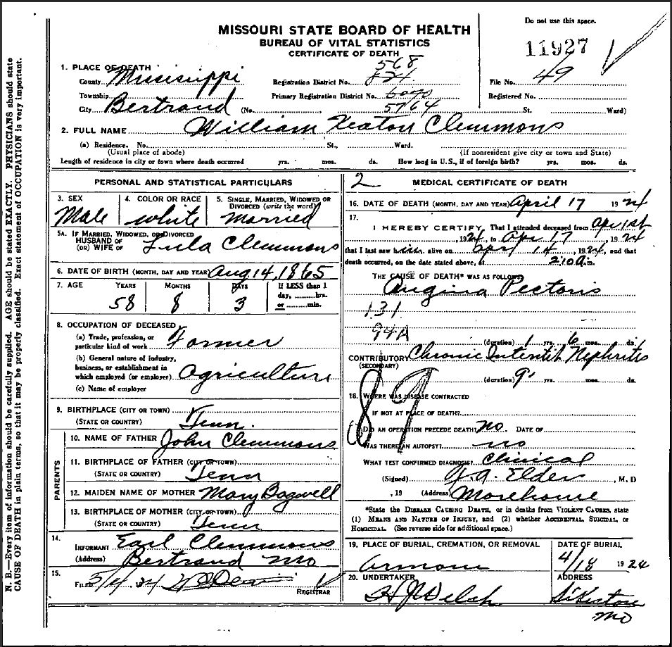The image below (click on it for a larger version) is the death certificate for my Great Great Grandfather, William Keaton Clemmons. He died on April 17th, 1924 in Bertrand, Mississippi County, Missouri. They were living in Morehouse, Missouri at the time.