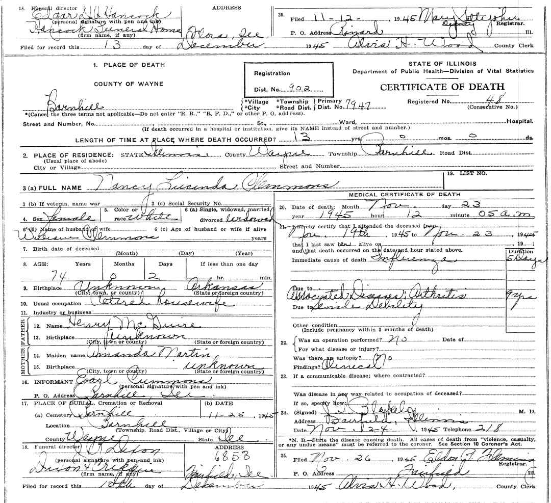Nancy Lucinda (McGuire) Clemmons was born (according to the death certificate) on November 21, 1871 in Arkansas. According to the 1900 census, she was born in January. She died November 23, 1945, just a few minutes after midnight. Cause of death was Influenza but she had been bed ridden for many years.