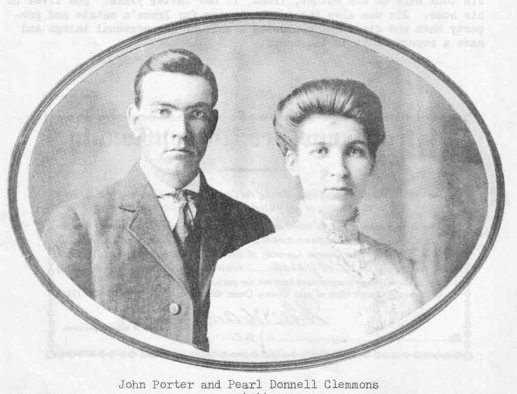 John Porter Clemmons was born May 12, 1888 and died February 10, 1912. He was the son of James Allen Clemmons and Elizabeth France Wynne. He was a descendant of Etheldred Clemmons Sr. John married Pearl Donnell on January 26, 1909. She was born November 15, 1887 and died February 20, 1985.