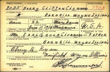 I could tell that the card was filled out by my grandfather. He only made it through the 8th grade in school, he never attended high school. It shows his date of birth and where he was born (Morehouse, Missouri). He listed his father as Mr. Earl Green Clemmons as the name of the person who will always know his address (I will come back to this in a bit). It shows that he is living in Barnhill, Illinois. On the backside, it shows his height as 5′-11″ and weighing 155 pounds. His serial number is 2035 and his order number is 1703.